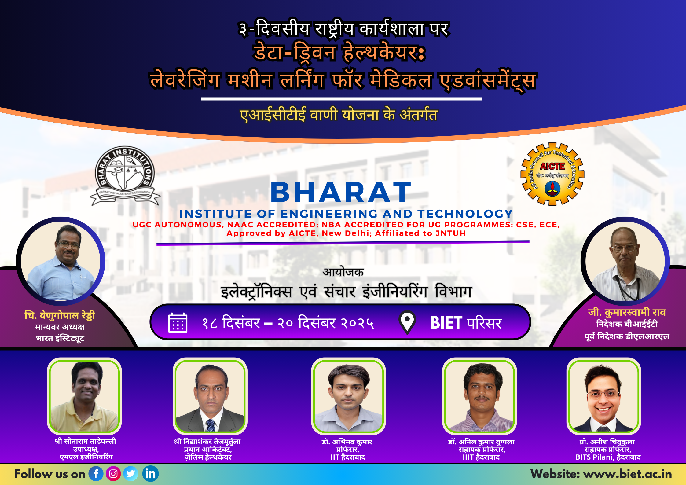 "AICTE sponsored ATAL VAANI " Three Days National Level Workshop on Data-Driven Healthcare: Leveraging Machine Learning for Medical Advancements" is being organised by Department of Electronics & Communication in Bharat Institute of Engineering and Technology from 18th to 20th December 2025
