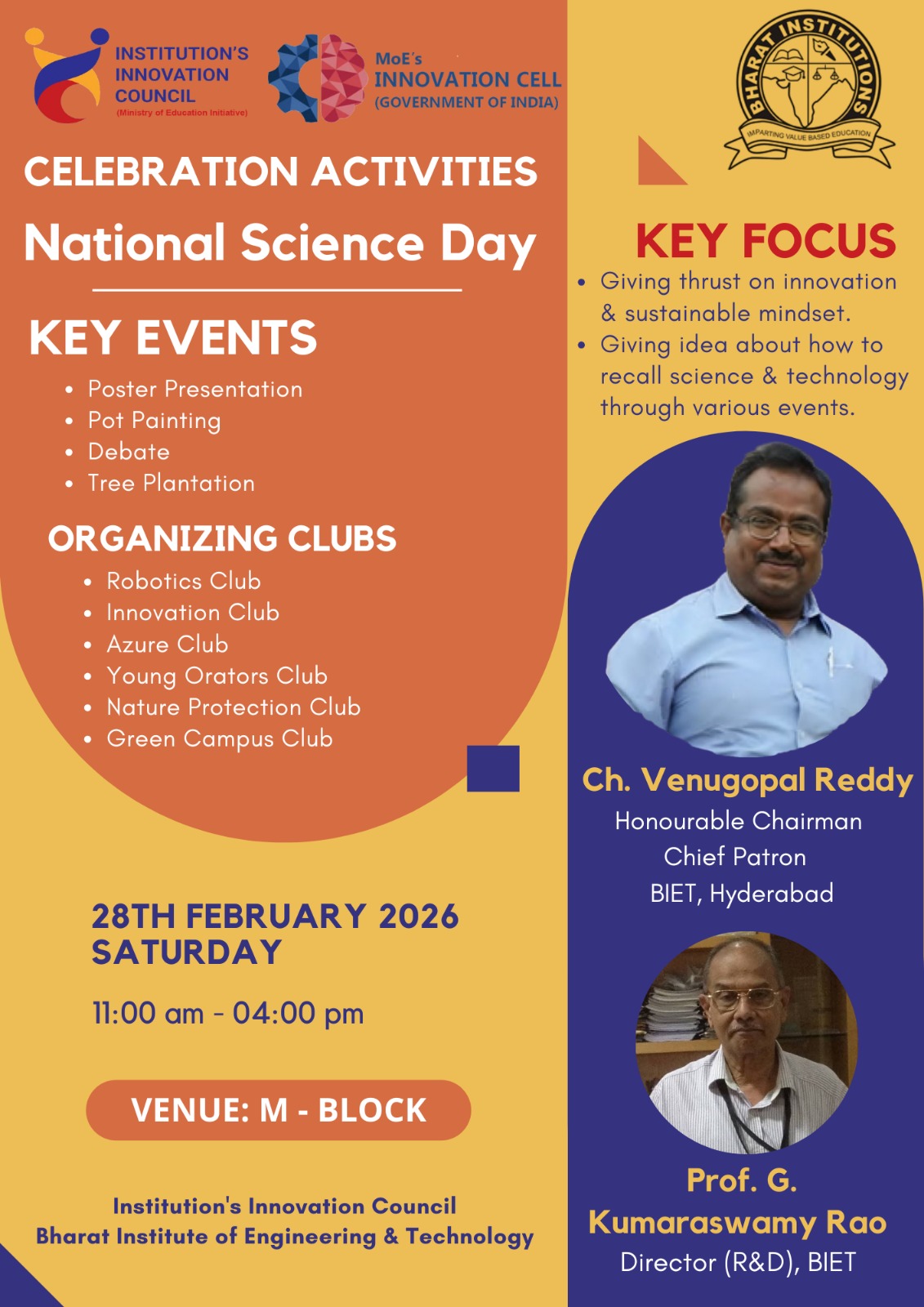 The Department of Chemistry, Bharat Institute of Engineering and Technology (BIET), Mangalpally, Hyderabad organizing a 2-Days event ““National Science Day Celebration 2025” for the first year B.Tech students on 27th – 28th February, 2025 in offline mode